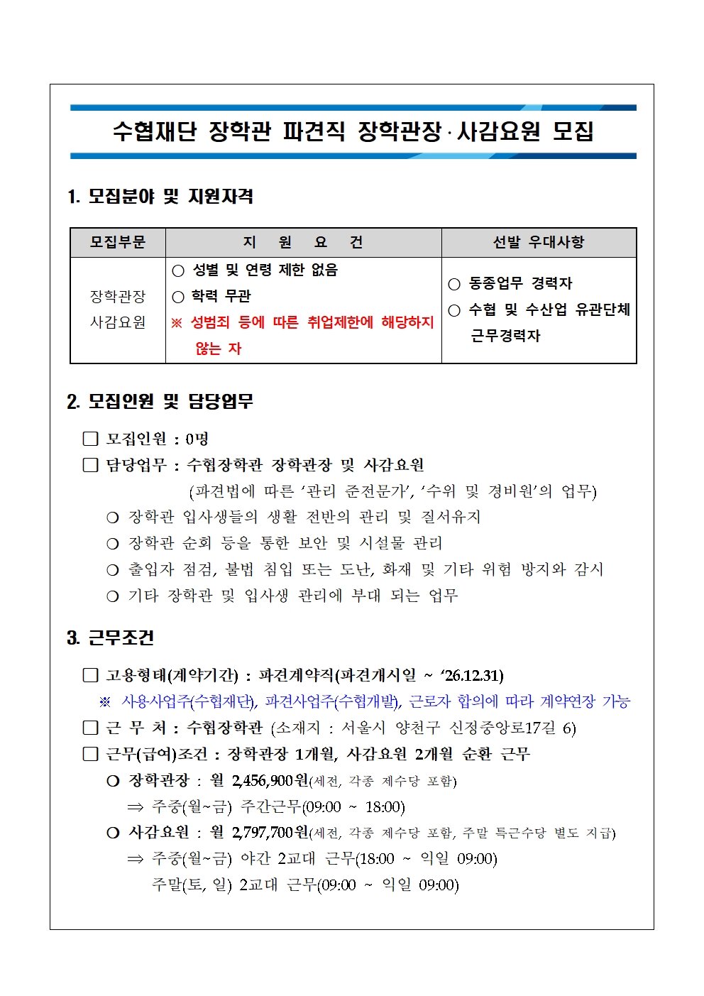 수협재단 장학관 파견직 장학관장, 사감요원 모집