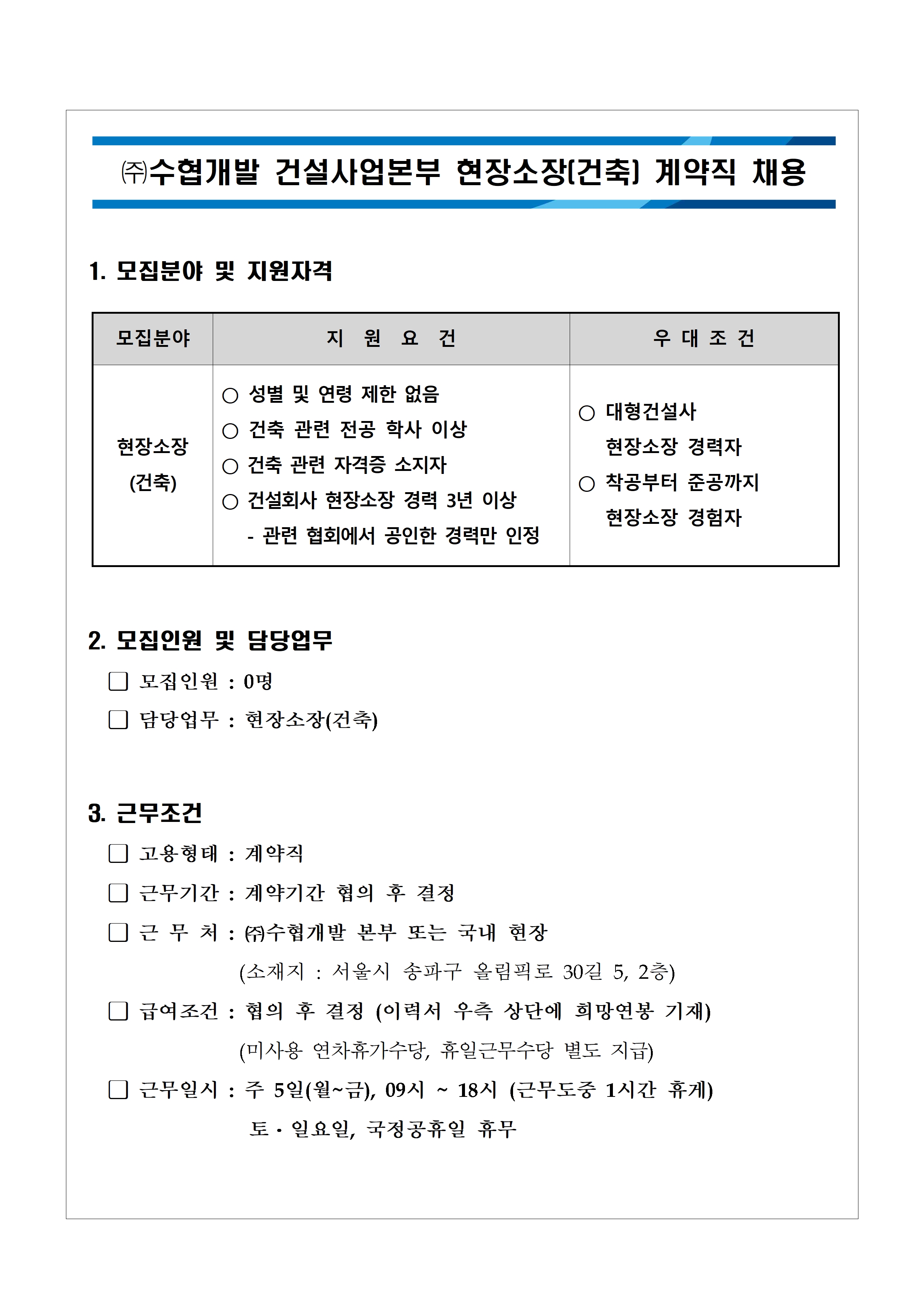 (주)수협개발 건설사업본부 현장소장(건축) 계약직 채용