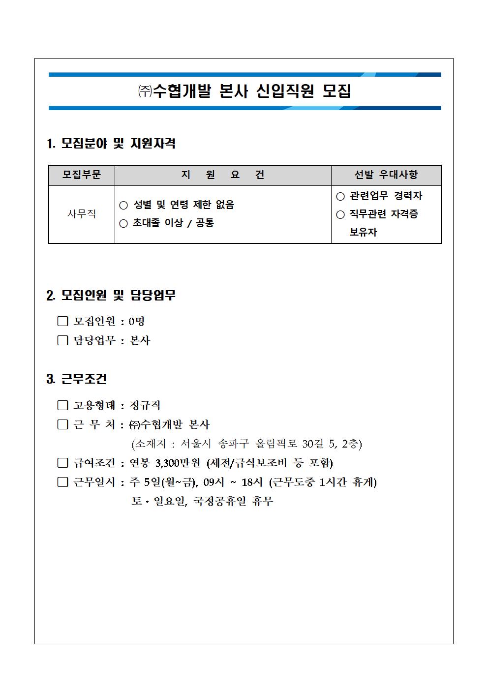 (주)수협개발 본사 신입직원 모집
