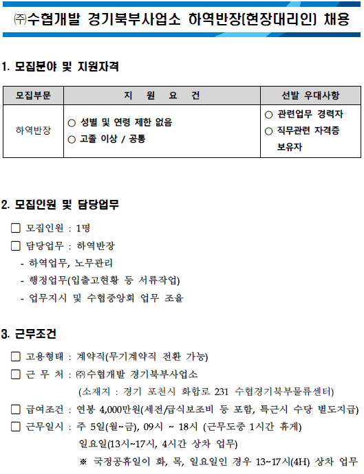 (주)수협개발 경기북부사업소 하역반장(현장대리인) 채용
