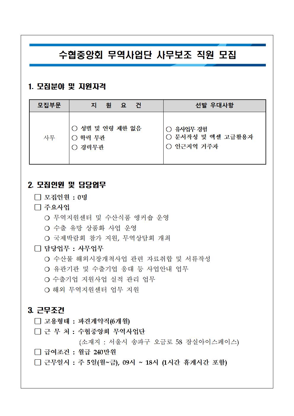 수협중앙회 무역사업단 사무보조원 모집[파견직]