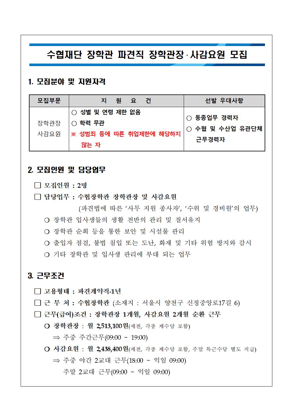 수협재단 장학관 파견직 장학관장-사감요원 모집