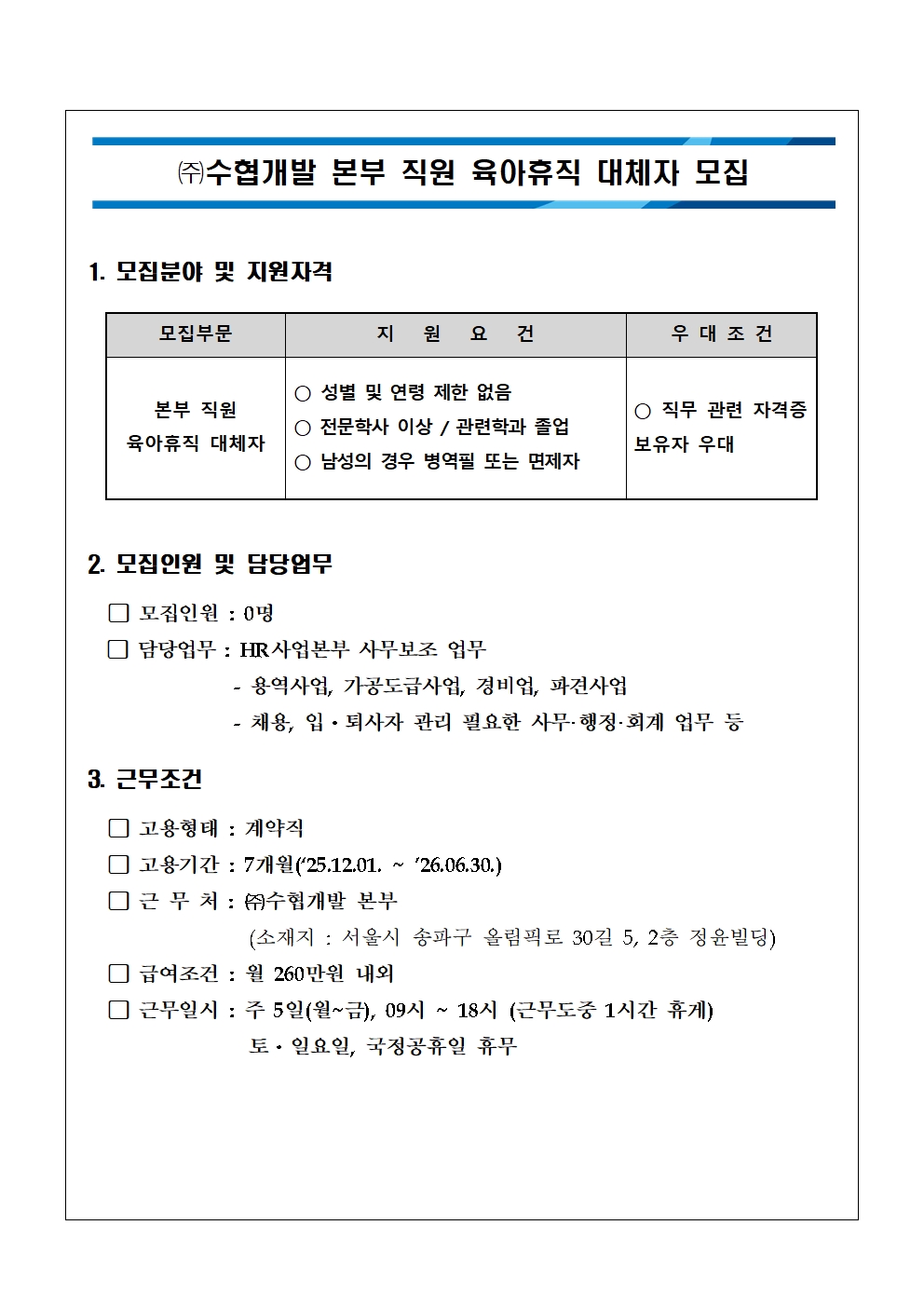(주)수협개발 본부 직원 육아휴직 대체자 채용