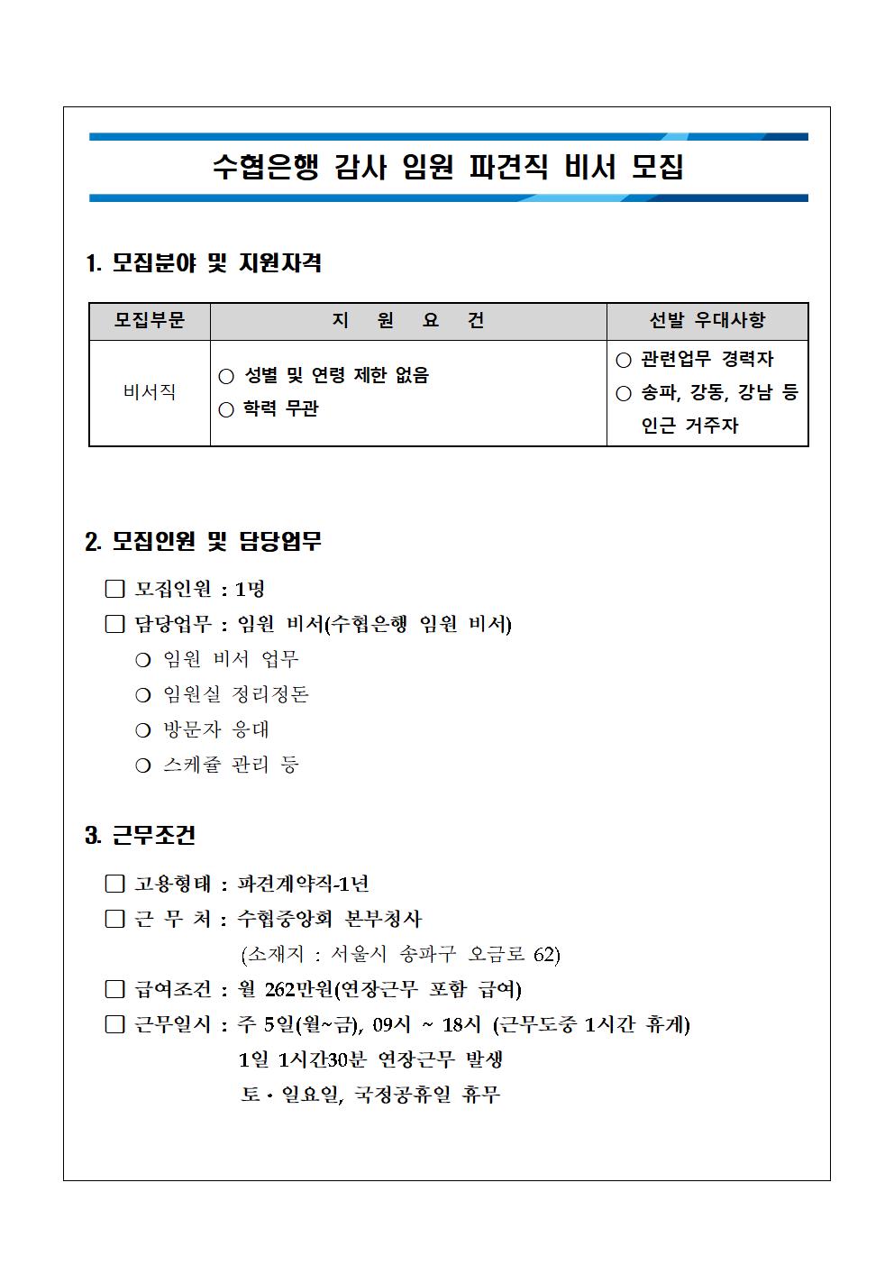 [HR사업본부-BS사업팀]수협은행 감사 파견직 비서 모집